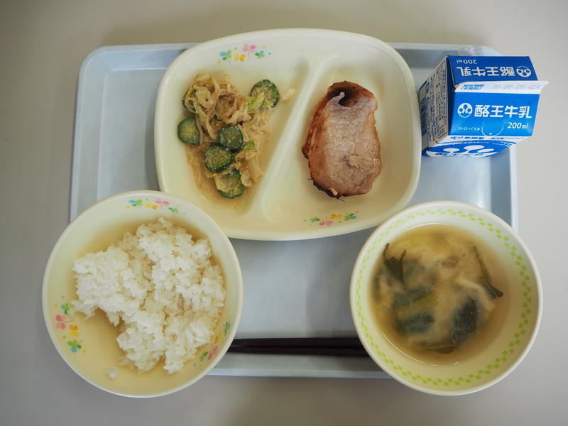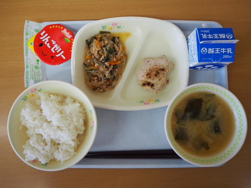 ごはん 豆腐のみそ汁 牛乳 鶏肉のみそマヨ焼き もやしのひき肉炒め りんごゼリー