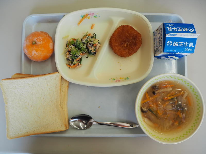 食パン ファイバースープ 牛乳 リッチなカレーコロッケ ひじきとツナのサラダ