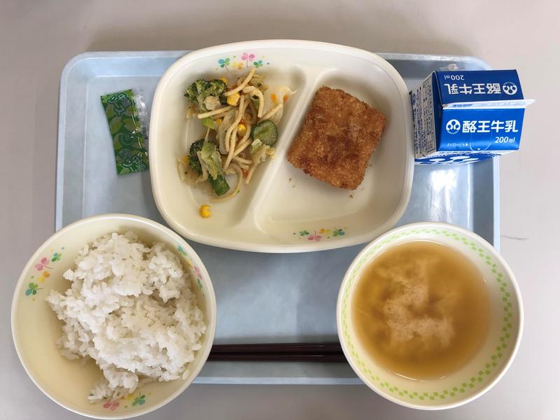 ごはん 牛乳 白身魚のフライ サラスパ 玉ねぎのみそ汁