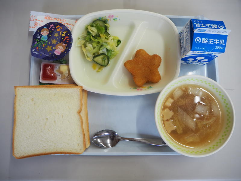 食パン 牛乳 いちご&マーガリン 星のコロッケ フレンチサラダ 銀河スープ 七夕ゼリー