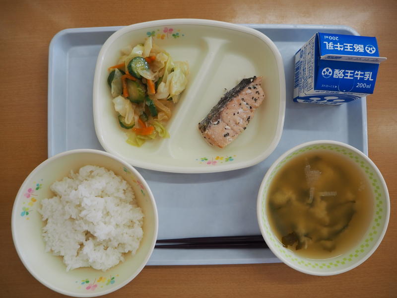 ごはん 牛乳 サケのハーブ焼き 和風サラダ じゃがいものみそ汁