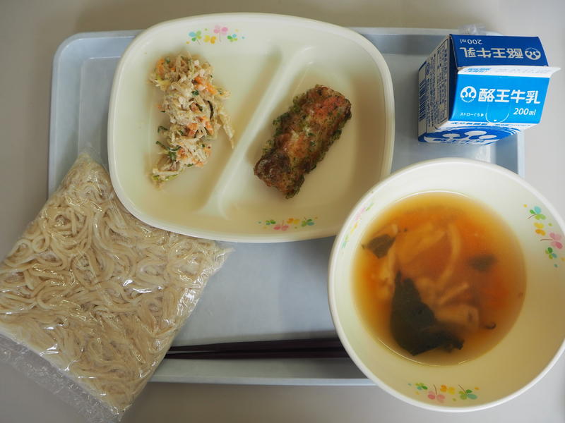 きつねうどん 牛乳 ちくわ磯辺揚げ ごぼうサラダ