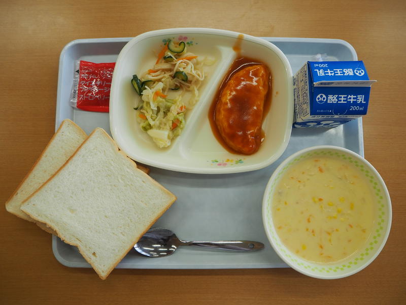 食パン 牛乳 いちごジャム オムレツデミソースかけ 糸かまサラダ 野菜果実ゼリー