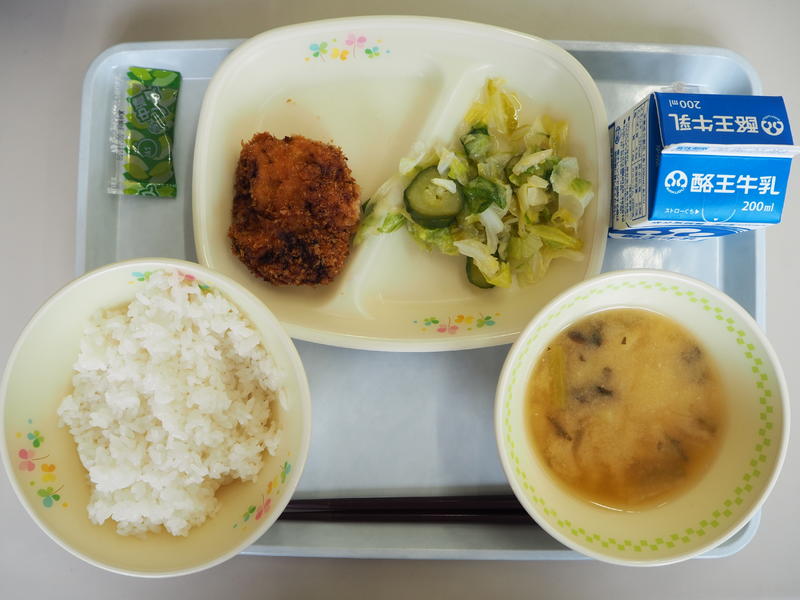 ごはん 牛乳 手作りメンチカツ フレンチサラダ 小松菜のみそ汁