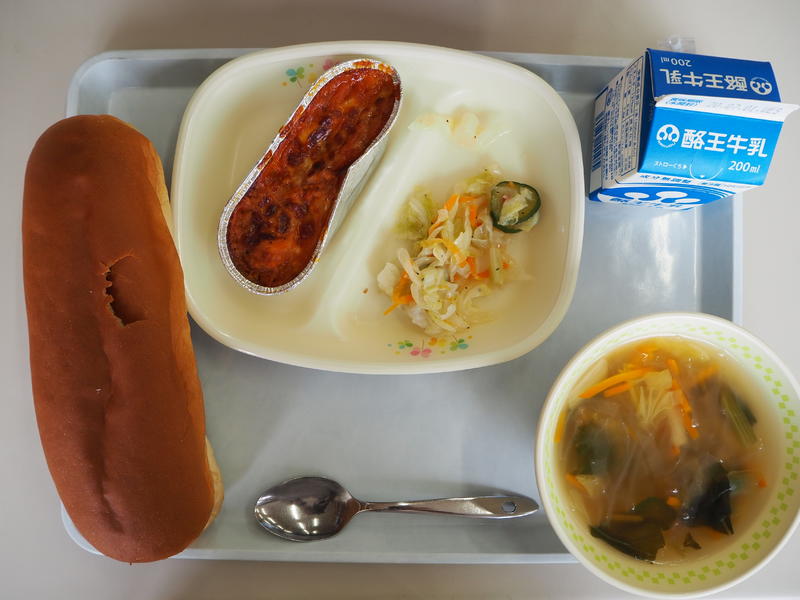 黒糖パン 牛乳 ポテトミートグラタン オニオンサラダ ファイバースープ