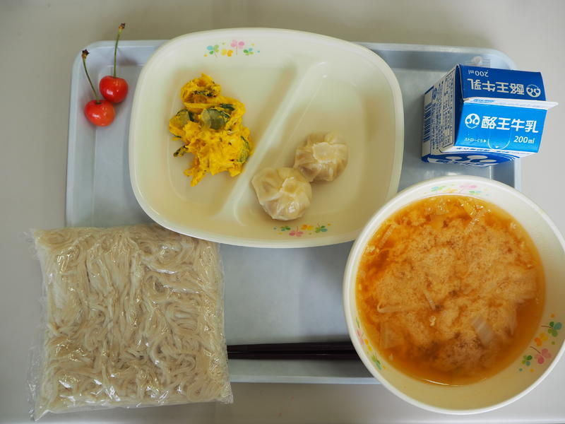 肉みそうどん 牛乳 パオズ かぼちゃサラダ さくらんぼ