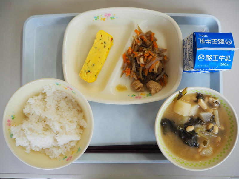 ごはん 牛乳 五目厚焼き玉子 茎わかめのきんぴら 大豆入りみそ汁
