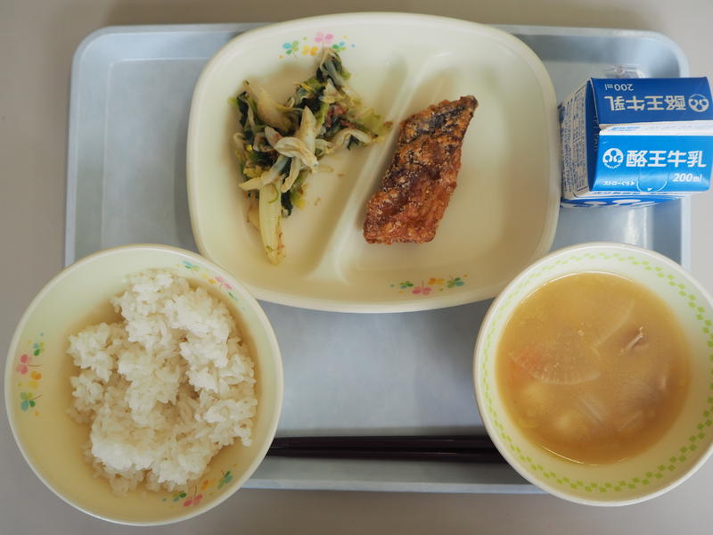 ごはん 牛乳 さばの香味揚げ キャベツのおかかあえ いも団子汁
