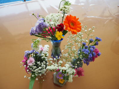 思い思いの花瓶とお花を選んだ生け花の作品です!!