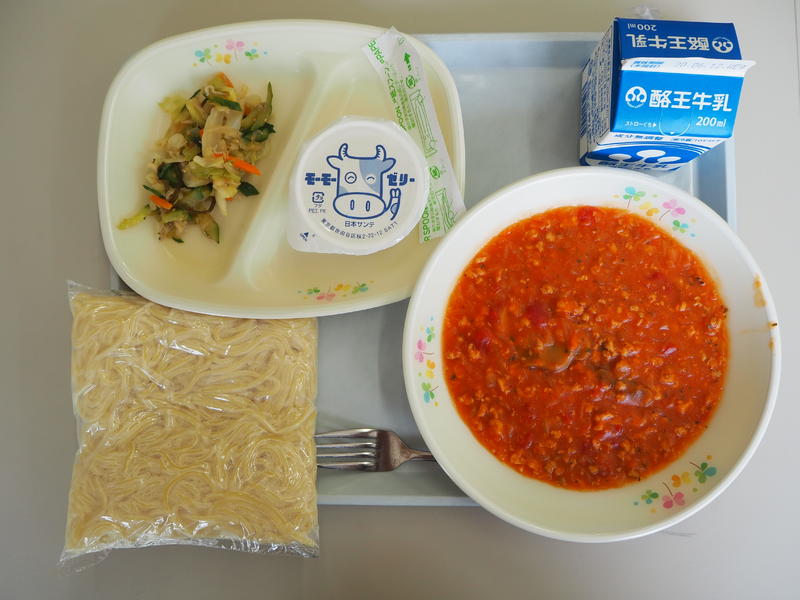 大豆ミートスパゲッティ 牛乳 かみかみサラダ ミルクゼリー