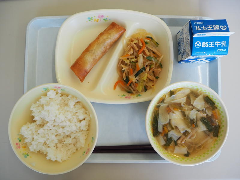ごはん 牛乳 春巻き 中華サラダ ワンタンスープ