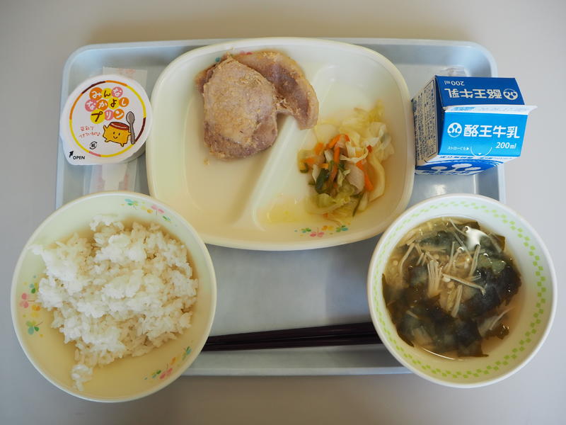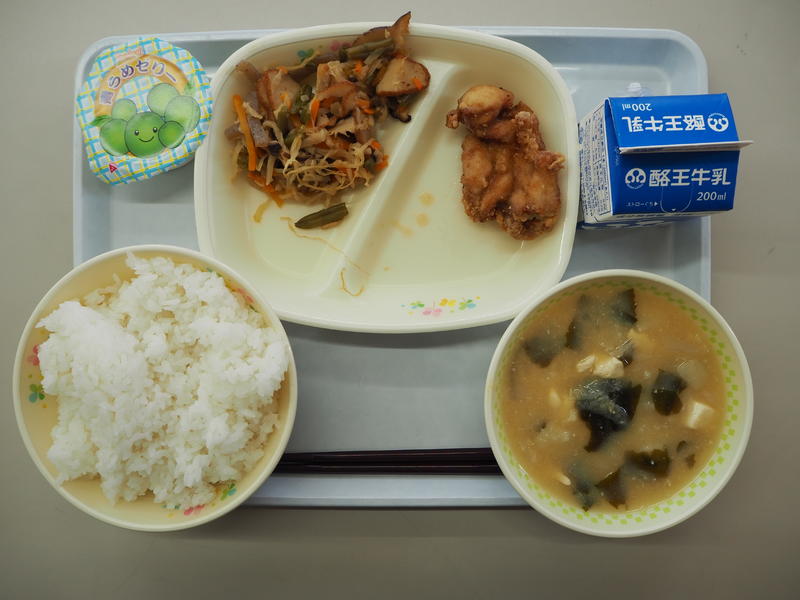 ごはん 牛乳 鶏唐揚げ 切り干し大根炒め煮 キャベツのみそ汁 梅ゼリー