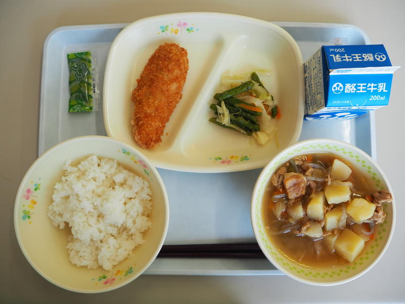 ごはん 牛乳 ササミカツ アスパラサラダ 肉じゃが