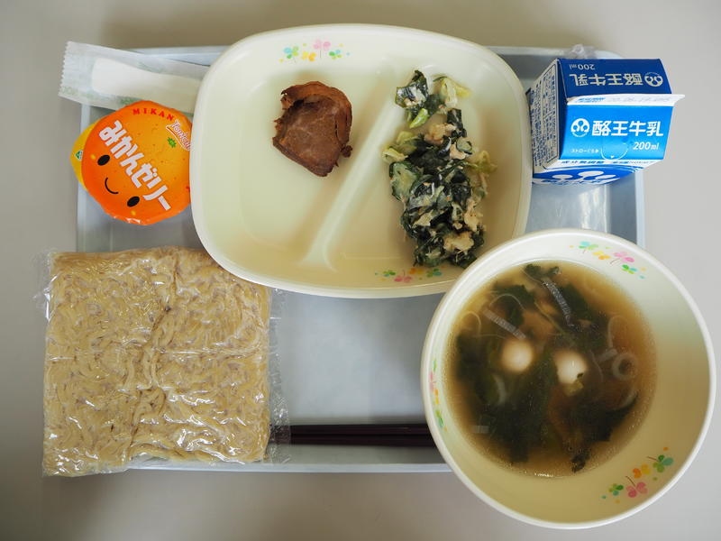 白河ラーメン 牛乳 みそドレッシングサラダ みかんゼリー