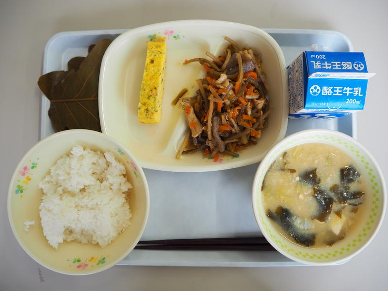 ごはん 牛乳 彩り野菜の厚焼き玉子 茎わかめのきんぴら キャベツのみそ汁 かしわもち