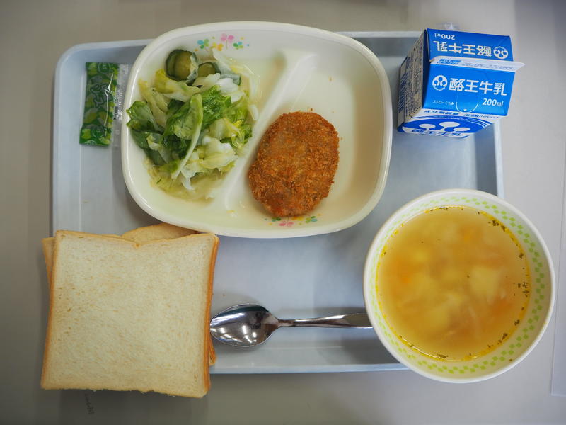 食パン 牛乳 いちごジャム ごぼうメンチカツ フレンチサラダ コンソメスープ