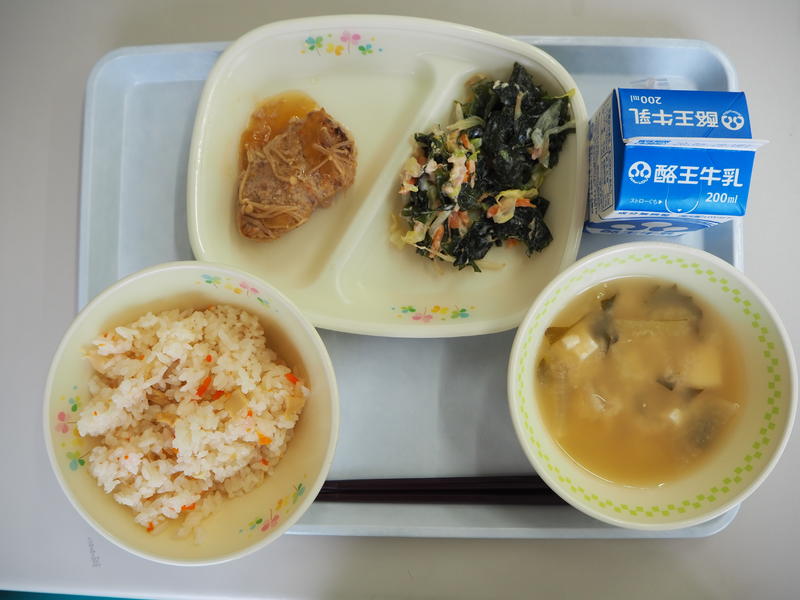たけのこごはん 牛乳 手作りハンバーグ和風ソースかけ わかめとツナのあえもの じゃがいものみそ汁