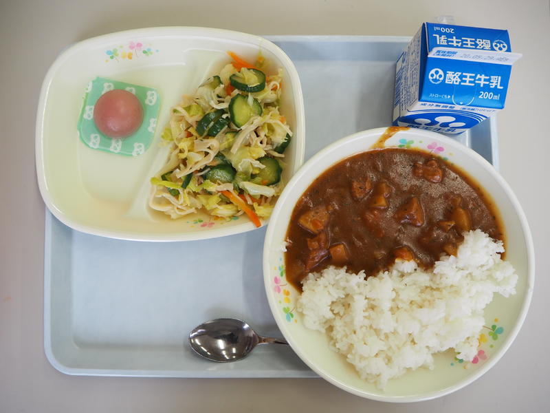 ポークカレーライス 牛乳 糸かまサラダ いちごゼリー