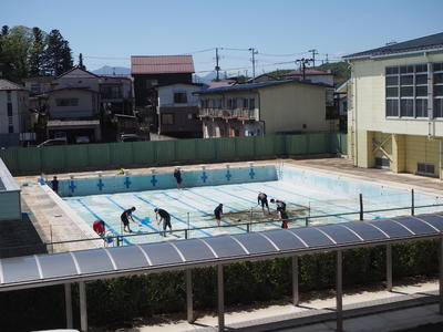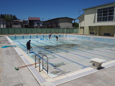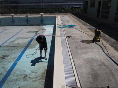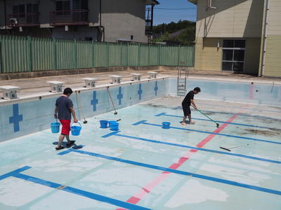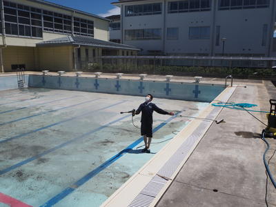 初夏を感じさせる陽気の中、休校が明けたらいつでも水泳部の活動や水泳の授業を始められるように体育科の先生中心に職員力を合わせてのプール清掃が始まりました!