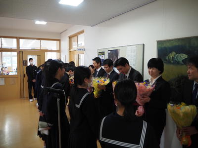 転退職員は放送で離任のあいさつをし、生徒会役員から花束を受け取りました。