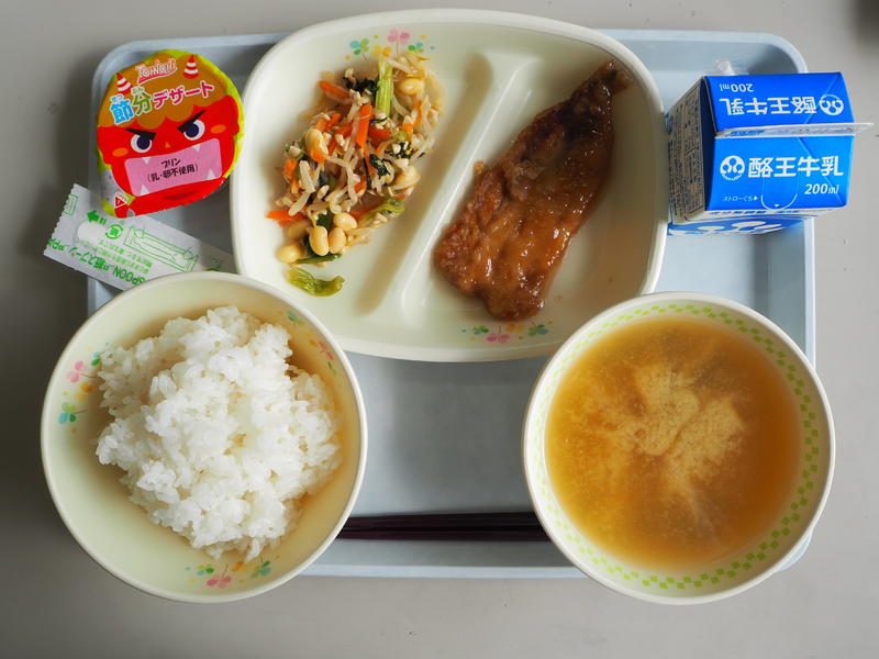 ごはん 牛乳 いわしのかば焼き 大豆サラダ 豆腐のみそ汁 節分デザート