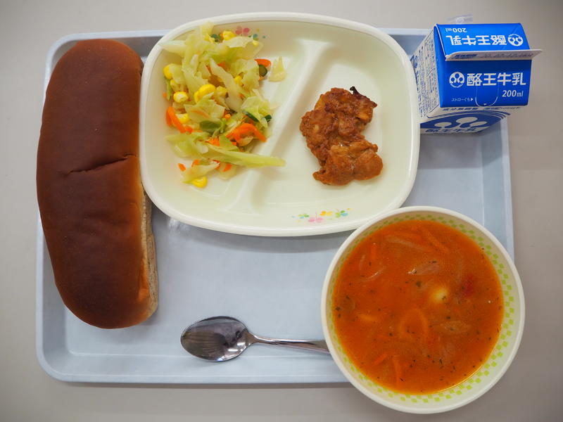 黒糖パン 牛乳 タンドリーチキン コールスローサラダ ミネストローネ