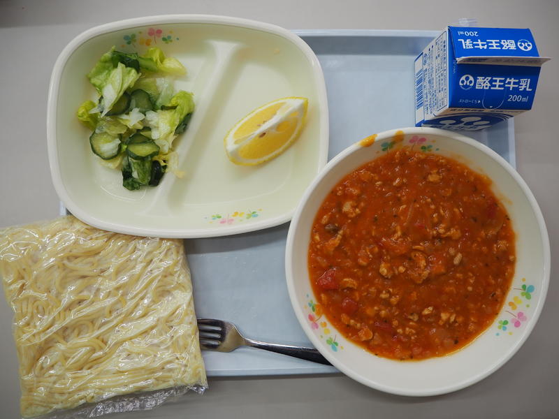 スパゲッティ大豆ミートソース 牛乳 フレンチサラダ くだもの(はるか)