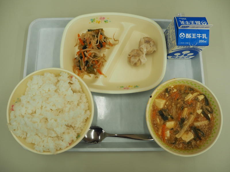 ごはん 牛乳 シューマイ もやしのラー油あえ マーボー豆腐