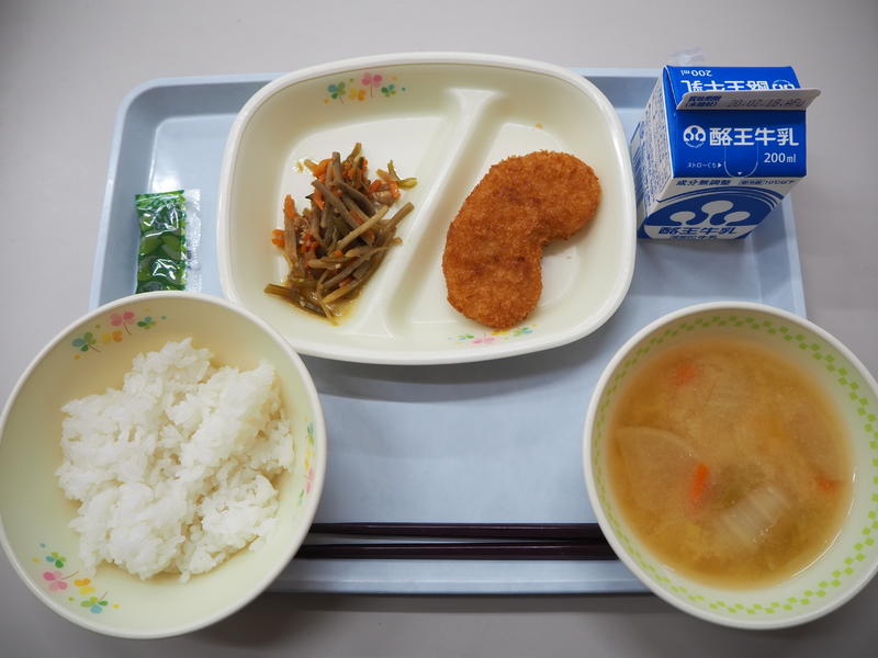 ごはん 牛乳 白花豆コロッケ 茎わかめのきんぴら 具だくさん汁
