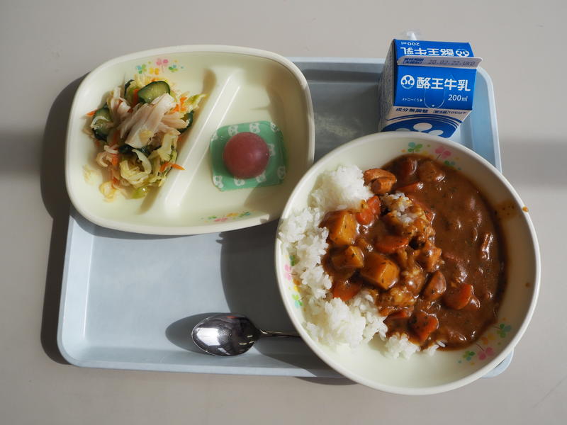 チキンカレーライス 牛乳 糸かまサラダ ピュアいちごゼリー