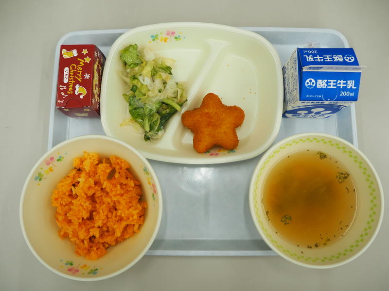 チキンライス 牛乳 星のコロッケ グリーンサラダ コンソメスープ クリスマスデザート