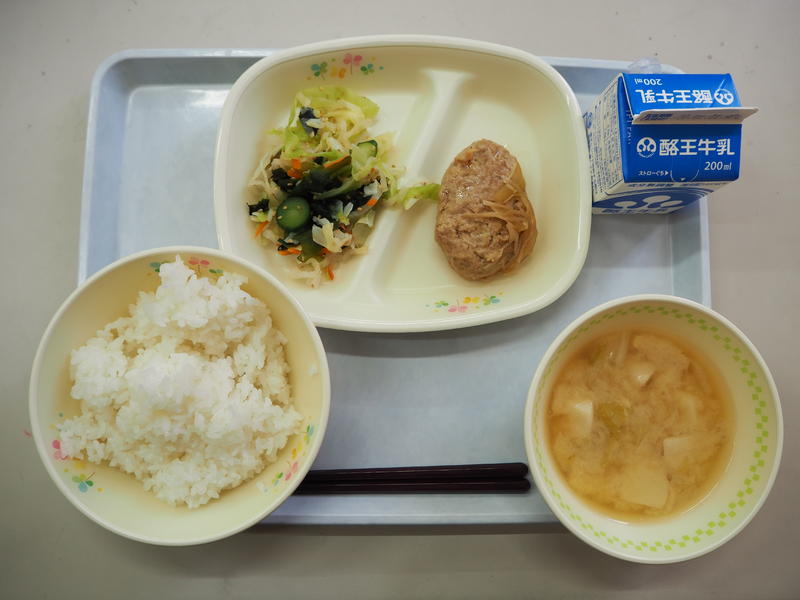 ごはん 牛乳 手作りハンバーグ もみ漬け 打ち豆のみそ汁