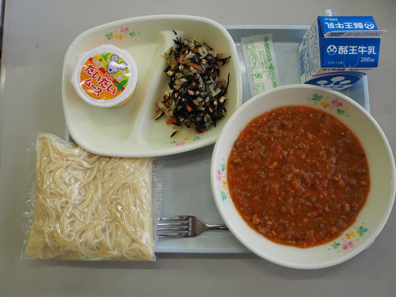 ミートソーススパゲッティ 牛乳 ひじきのマリネ だいだいムース