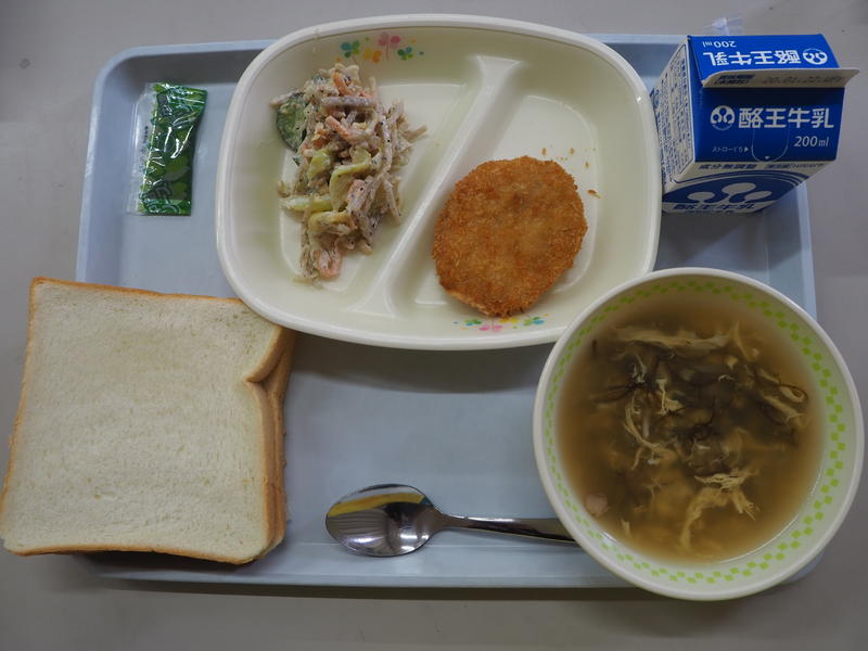 食パン 牛乳 キャベツメンチ ごぼうサラダ もずくスープ