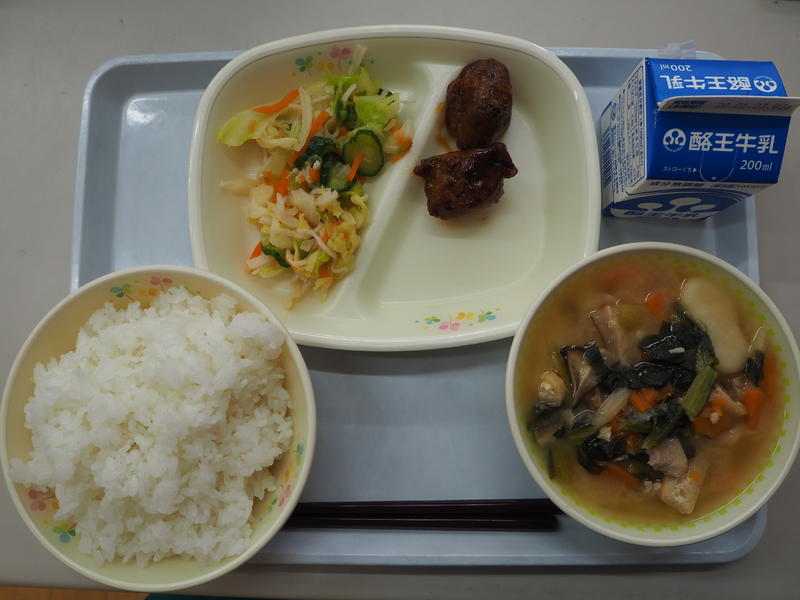 ごはん 牛乳 五目野菜肉団子 糸かまサラダ すいとん汁