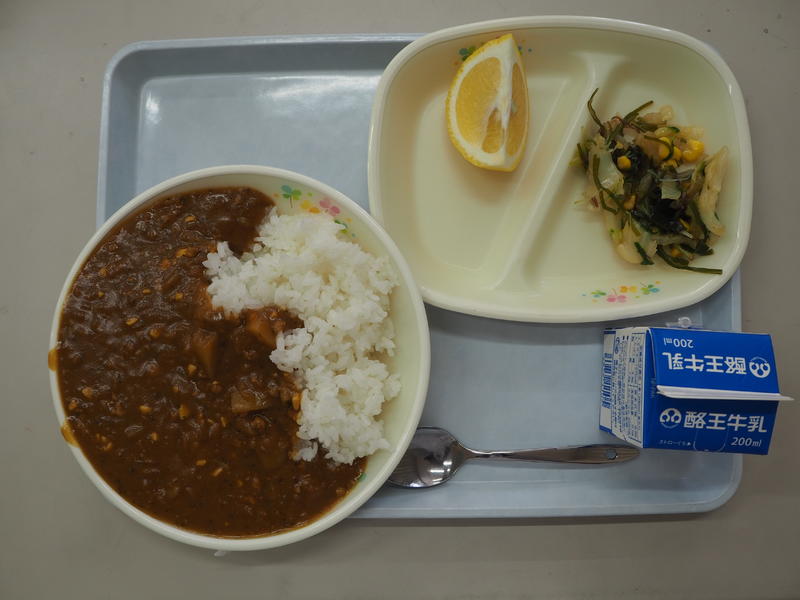 キーマカレーライス 牛乳 海藻サラダ はるか