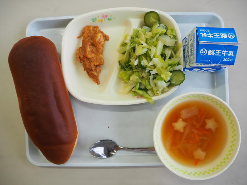 黒糖パン 牛乳 タンドリーチキン フレンチサラダ コーンスープ