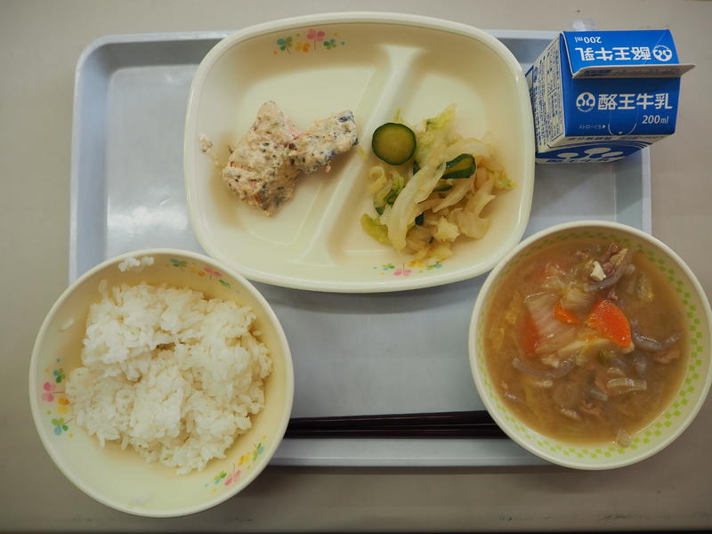 ごはん 牛乳 サケのみそマヨ焼き 浅漬け けんちん汁