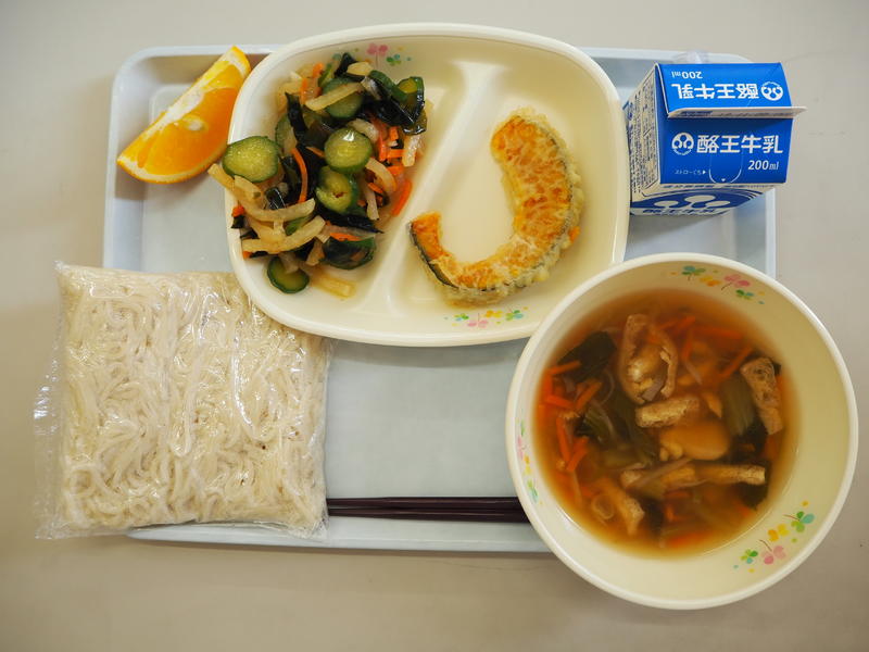 きつねうどん 牛乳 かぼちゃの天ぷら 大根サラダ オレンジ