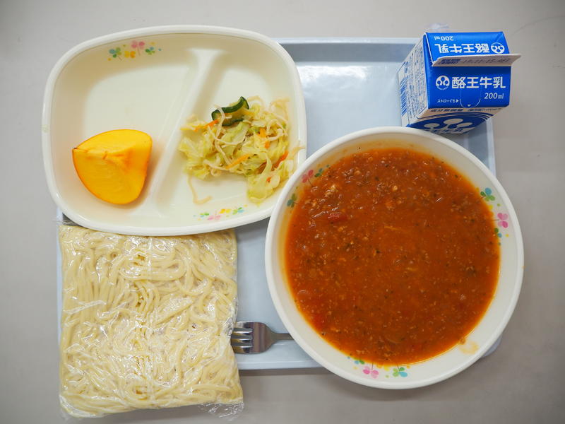 ミートソーススパゲッティ 牛乳 糸カマサラダ 柿
