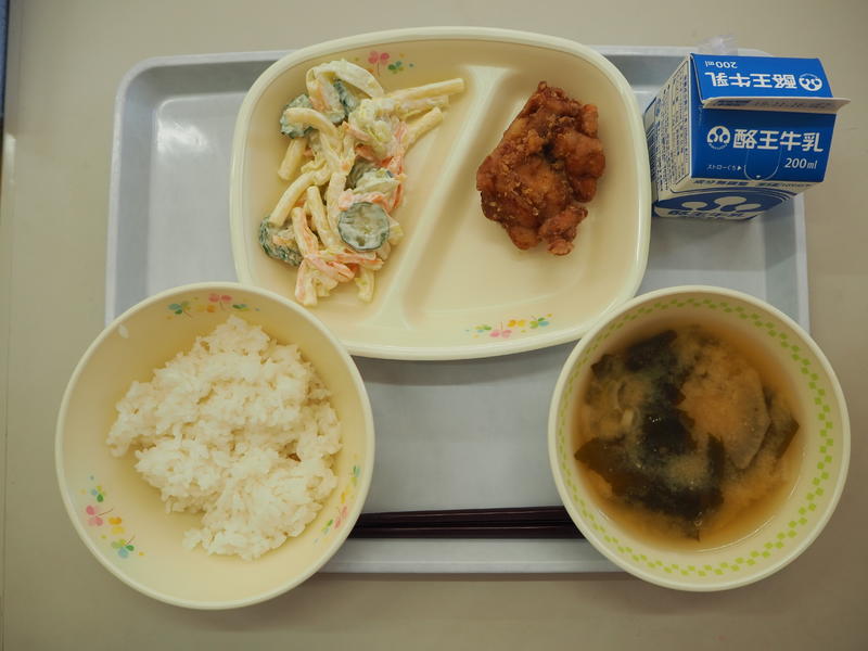ごはん 牛乳 鶏の唐揚げ マカロニサラダ 厚揚げのみそ汁