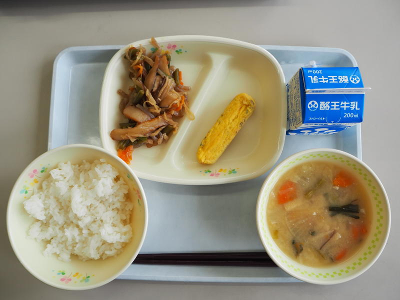 ごはん 牛乳 彩り野菜の厚焼き玉子 切り干し大根の炒め煮 すいとん汁