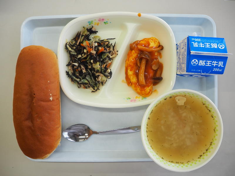 黒糖パン 牛乳 オムレツのきのこソースかけ ひじきのマリネ コンソメスープ