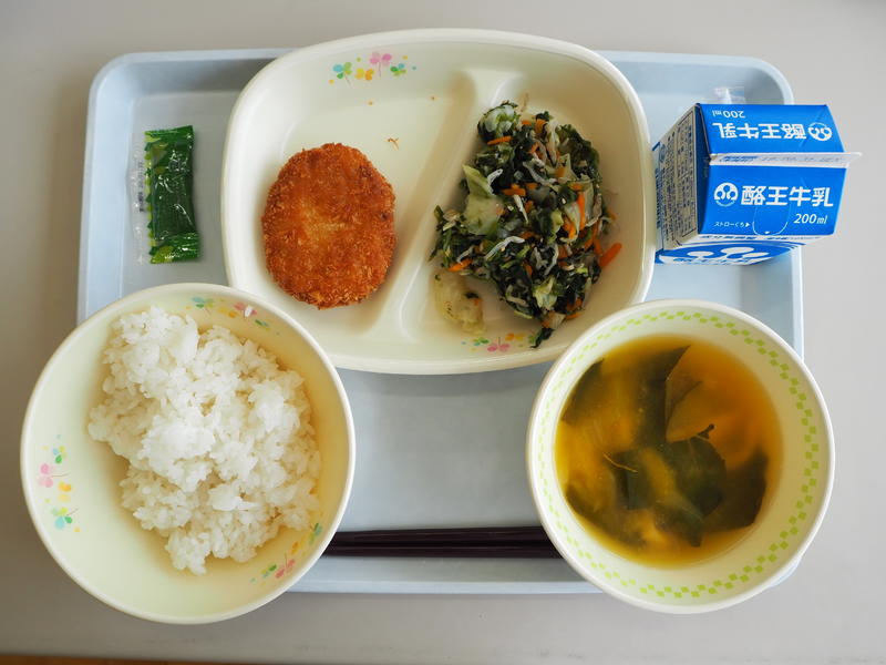 ごはん キャベツメンチカツ いそあえ かぼちゃのみそ汁