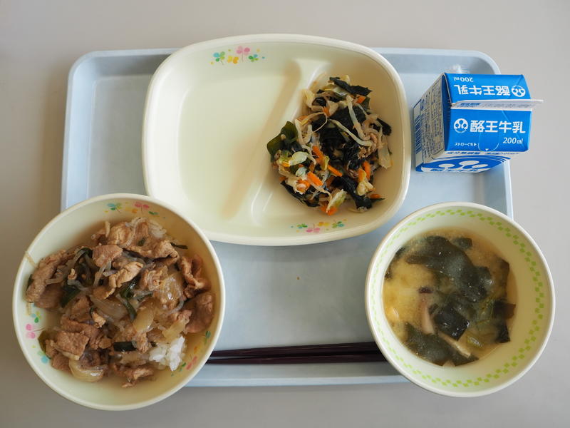 焼き肉丼 牛乳 わかめとツナのあえもの 小松菜のみそ汁