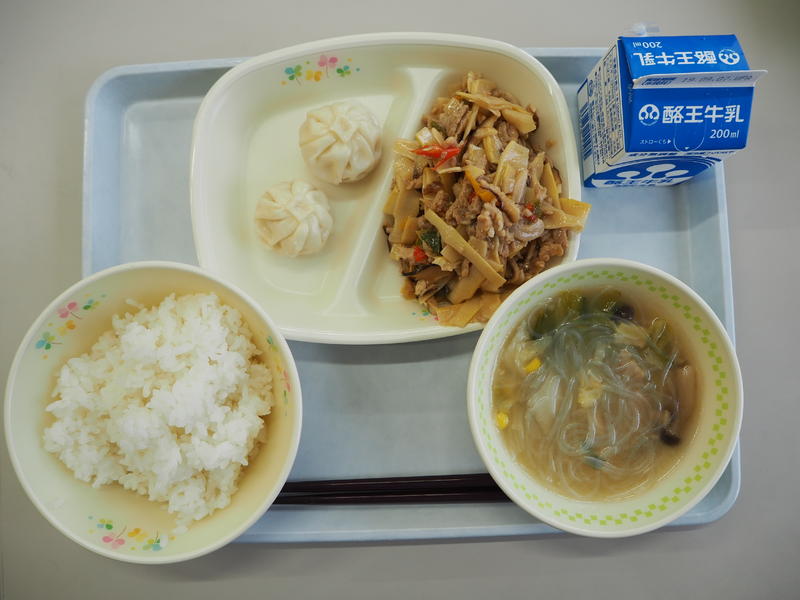 ごはん 牛乳 ショーロンポー チンジャオロースー 春雨スープ