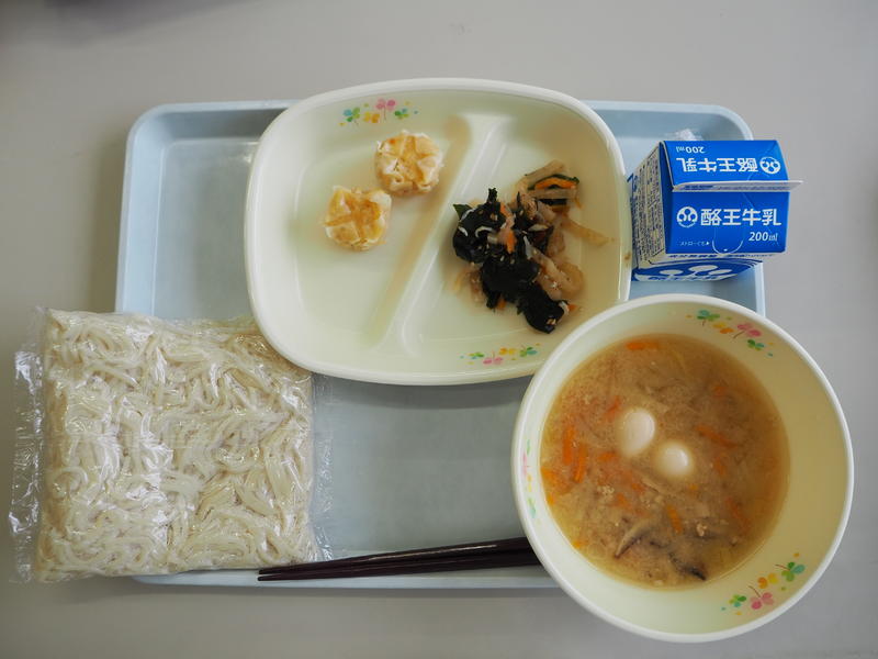 肉みそうどん 牛乳 人参入りシューマイ 大根とシャコのサラダ
