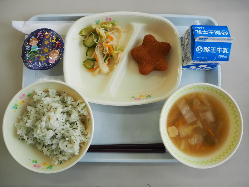 かおりごはん 牛乳 星のコロッケ 糸かまサラダ 銀河スープ 七夕三色ゼリー