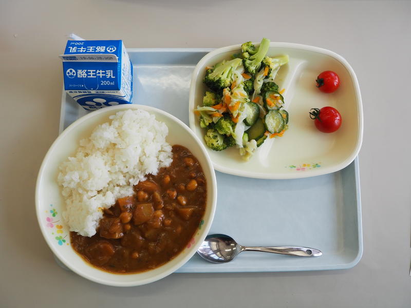 ビーンズカレー 牛乳 ブロッコリーサラダ ミニトマト