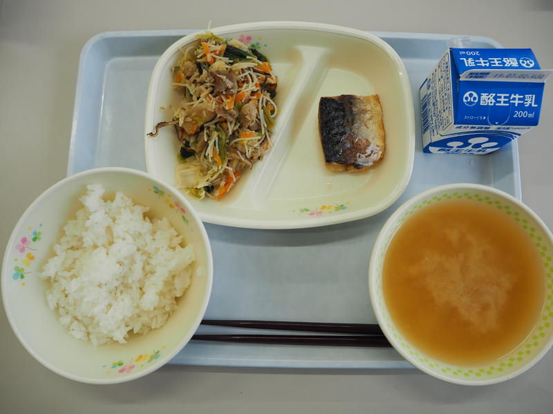 ごはん 牛乳 さばの塩焼き ビーフン炒め 玉ねぎのみそ汁